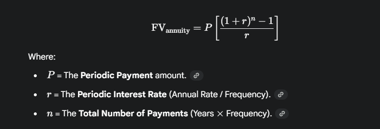 The formula for the Future Value of an Ordinary Annuity (payments made at the end of the period) is:
